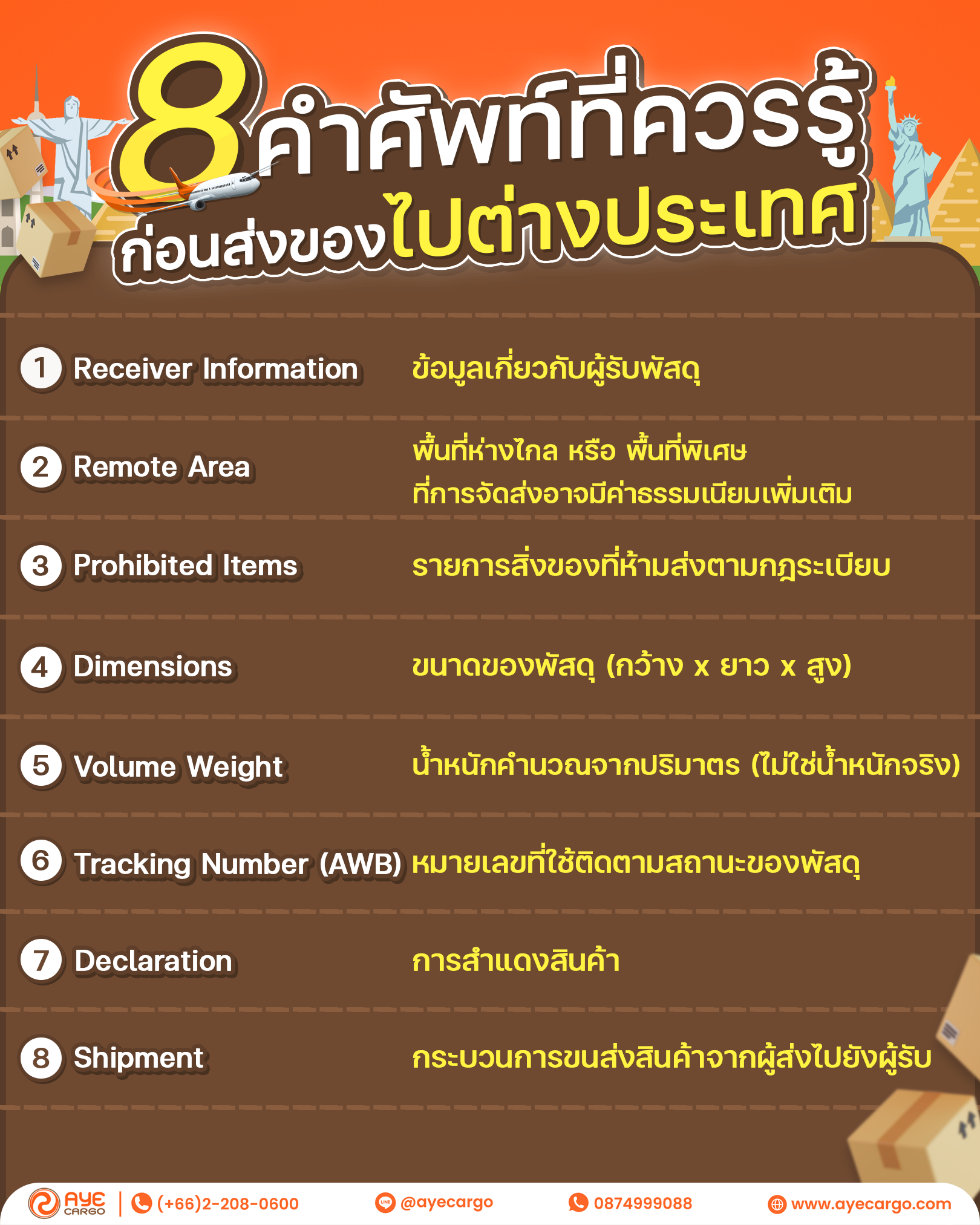 การรู้คำศัพท์เกี่ยวกับการขนส่งของไปต่างประเทศเป็นสิ่งสำคัญที่ช่วยให้การทำธุรกรรมของคุณสะดวกและเข้าใจง่ายขึ้น โดยเฉพาะเมื่อคุณต้องการส่งพัสดุไปต่างประเทศ การเข้าใจคำศัพท์พื้นฐานที่เกี่ยวกับการขนส่ง จะช่วยให้คุณสามารถติดตามและจัดการการส่งของได้ถูกต้องและมีประสิทธิภาพ ไม่ว่าจะเป็นเรื่องการเลือกบริการที่เหมาะสม หรือการติดต่อสอบถามสอบถามเกี่ยวกับข้อกำหนดต่างๆกับบริษัทขนส่ง ถ้าคุณไม่เข้าใจคำศัพท์ที่ใช้ในกระบวนการขนส่ง อาจทำให้เกิดความสับสนหรือข้อผิดพลาดได้