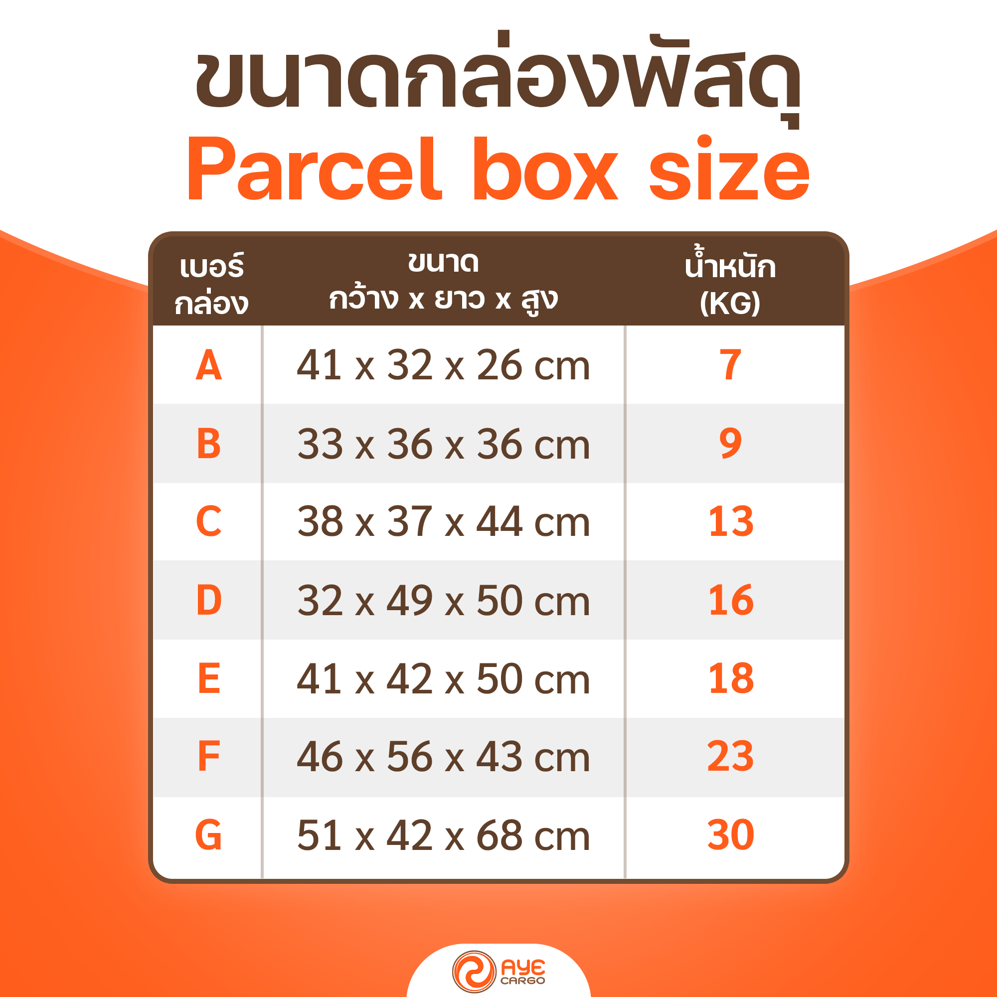 เพื่อให้คุณสามารถเลือก ขนาดกล่องพัสดุ ได้เหมาะสมกับของที่ต้องการจัดส่ง ลองดูตารางขนาดกล่องพัสดุเบื้องต้นต่อไปนี้ ซึ่งรวมทั้ง กล่องพัสดุขนาดเล็กไปจนถึงกล่องพัสดุขนาดใหญ่ ครอบคลุมทุก ไซส์กล่องพัสดุ ยอดนิยมที่ใช้ในการส่งของไปต่างประเทศ